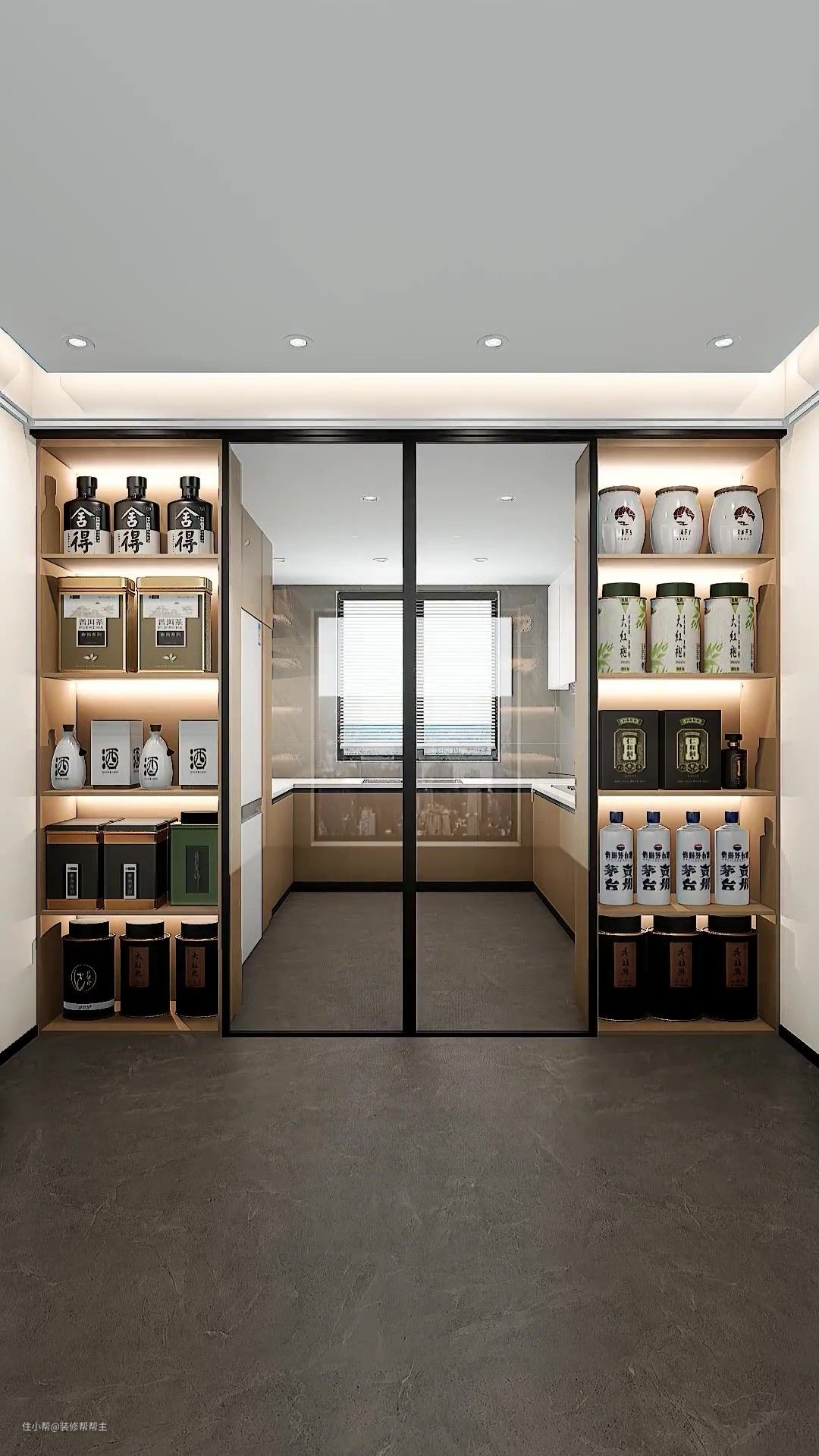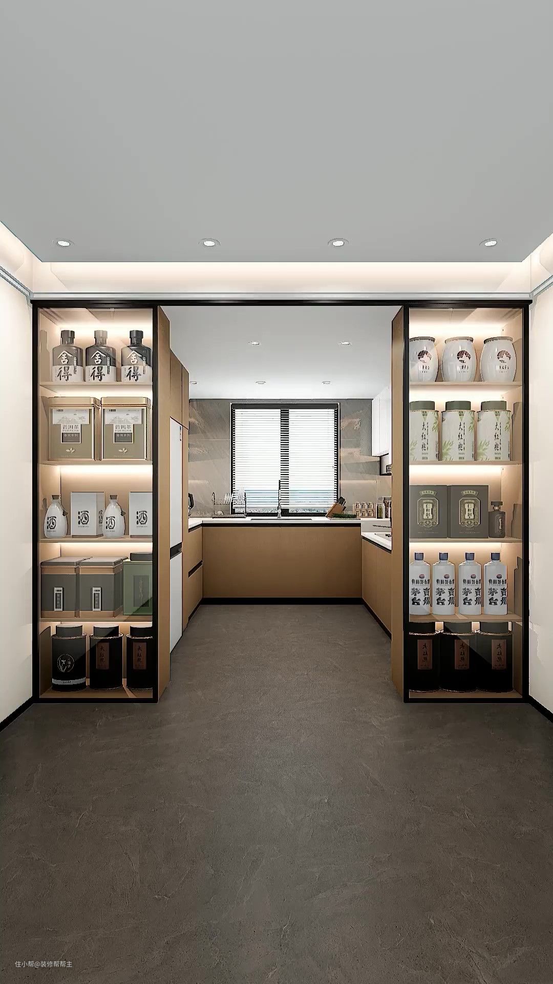 厨房不安装传统的平开门,也不安装传统的推拉门,平常进出都不方便,而且还容易藏污纳垢,而是拆除非承重墙体,在两边做酒柜,酒水、茶叶统统放入内,安装吊轨推拉门,清洁卫生好打理,关上是厨房门,打开就是酒柜门,进出更宽敞。