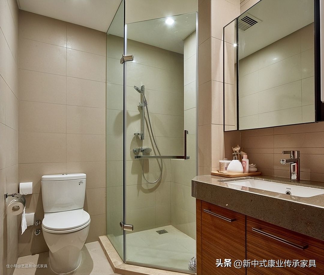 卫生间布局井然,尽显现代简约之风与沉稳之美,玻璃门巧妙分隔干湿区域,既实用又提升了整体美观度;实木定制洗漱台简约而不失雅致,内置收纳柜更添便捷。