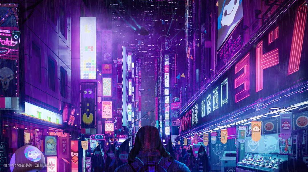 冷色调的高楼建筑、霓虹灯、街头广告牌等元素常在赛博朋克中见到。