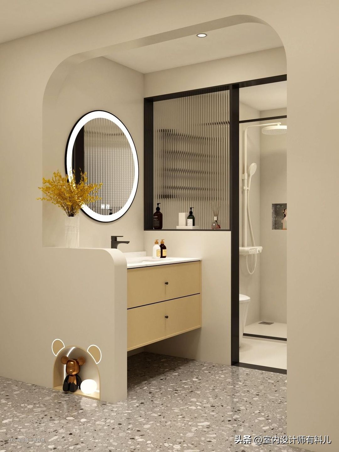 真想将洗漱台外移的,建议半墙上要加玻璃隔断,或者在半墙处定制通顶的柜子,不仅满足洗漱台处的日常用品收纳,柜子内囤货都没问题。