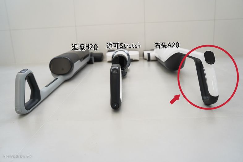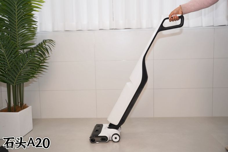 但是石头A20的手柄结构问题,导致无法彻底躺平,从机身高度14cm到握手高度16cm,整个机身是倾斜的,无法做到像追觅和添可完全180°的躺平状态。