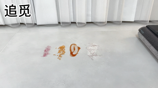 在家用清洁电器领域,洗地机的清洁能力表现非常出色,尤其是在机器直立的状态下,可以说是横推地面肉眼可见的污渍、垃圾。通过口红、零食碎渣、番茄酱和面粉等干湿垃圾的组合,模拟地面脏污的状态,让我们来看三者的表现吧