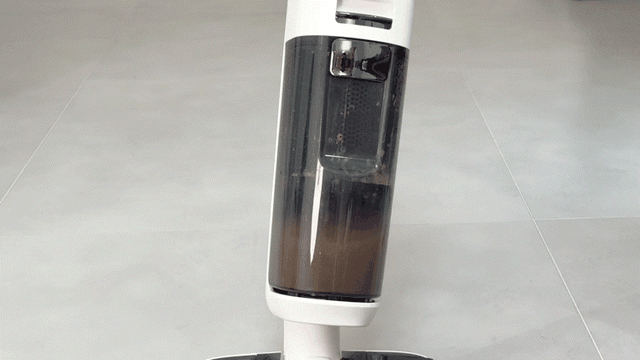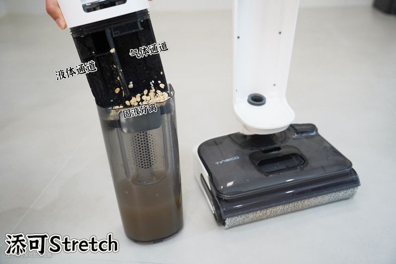 可以看到添可stretch在工作状态下,污水箱内部的运转情况,从暴风吸入到固液垃圾的泾渭分明,后期清洁打理更省心,无需二次垃圾分类。