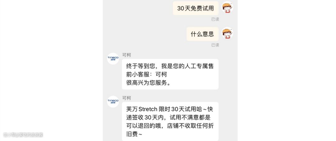 入手的过程中,有一点让我很惊讶,因为添可stretch宣传页上标注了限时30天试用,跟客服小姐姐再三确认,也就是收到快递30天内,试用不满意都是可以退回的,关键还不收取任何折旧费。