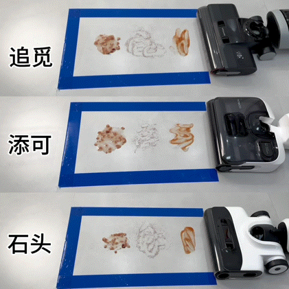 通过番茄酱、面粉、八宝粥模拟家具底部脏污状况,不论是添可stretch、追觅H20 Ultra、还是石头A20,皆可一次性完美清洁地面。