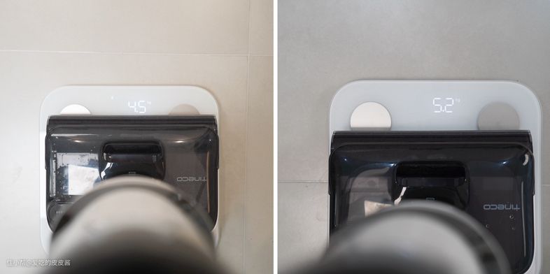 首先,添可stretch整体机身自重(包含电池)实测重量为4.5kg,在清水箱装满的情况下,实测重量为5.2kg,三款躺平洗地机份量感最轻的一位实力选手。