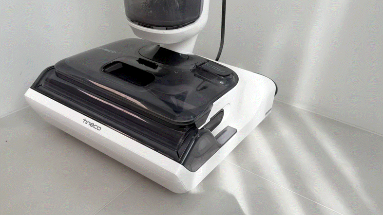 但很有意思的是,添可stretch竟然将清水箱放置于刷头的上方,机身结构调整相当有巧思,首先是为机身大幅度减重,将重力下压,但是刷头高度并未增加,同时保证了清、污水箱最大承载容量和续航能力。