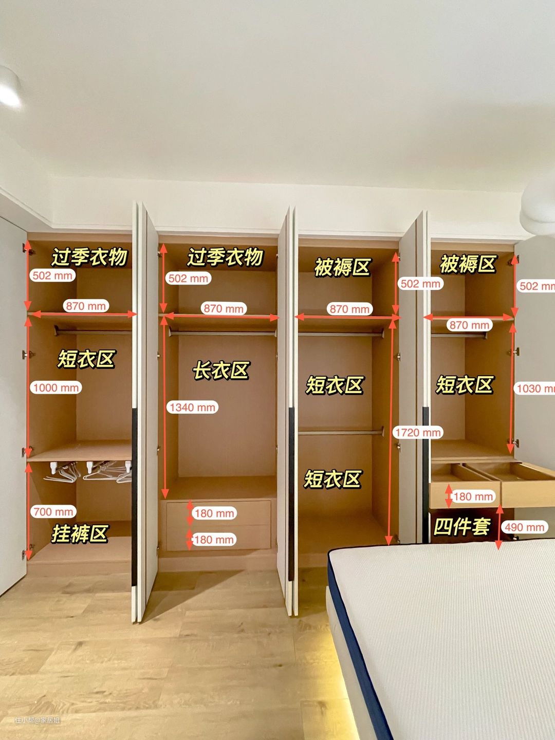 下方设计几个大抽屉,用来收纳内衣、内裤、袜子等,挂衣区上方放不常用到的东西。