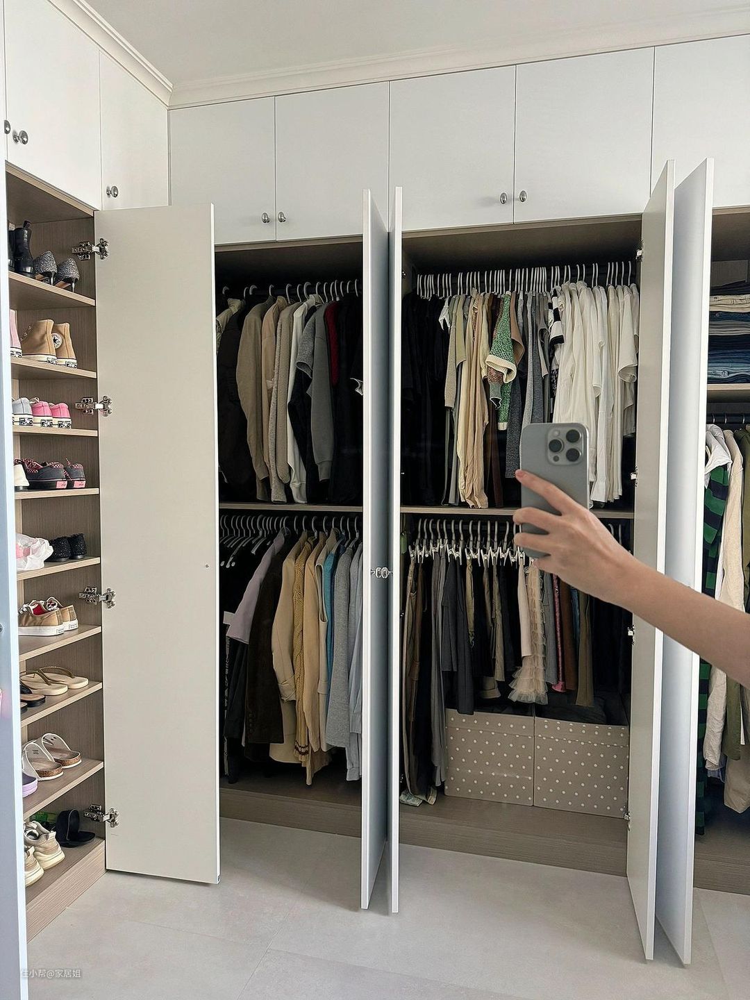 不是说懒,现在的年轻人都不喜欢叠衣服,全部用挂的,所以,衣柜全做成挂衣区,衣服挂上就完事了,取用方便。