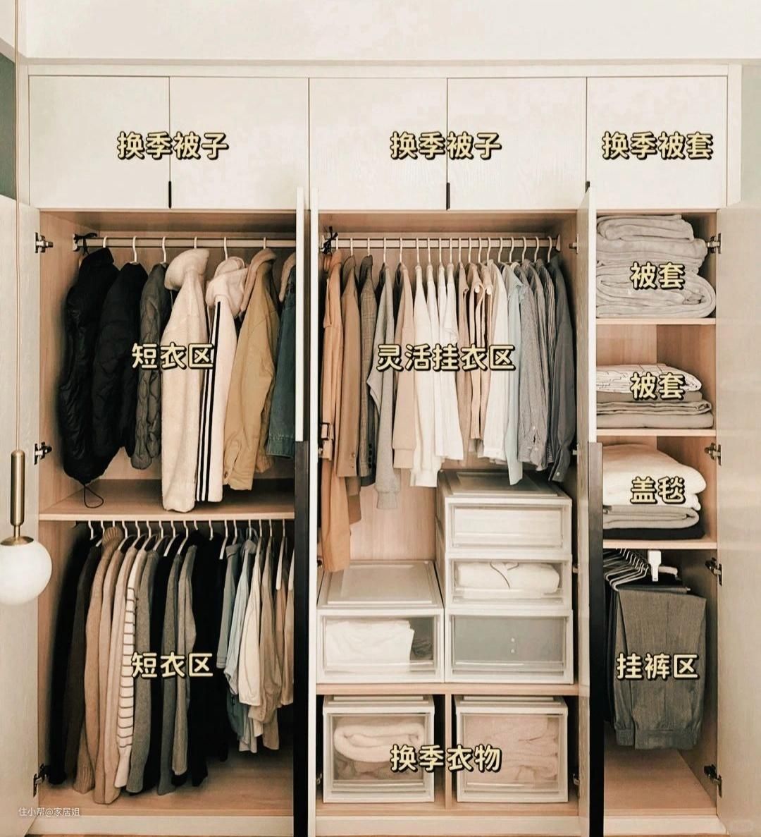 叠放区在最上层,可以根据功能不同分为被褥区、换季区。这些区域用来存放低频使用的物品。