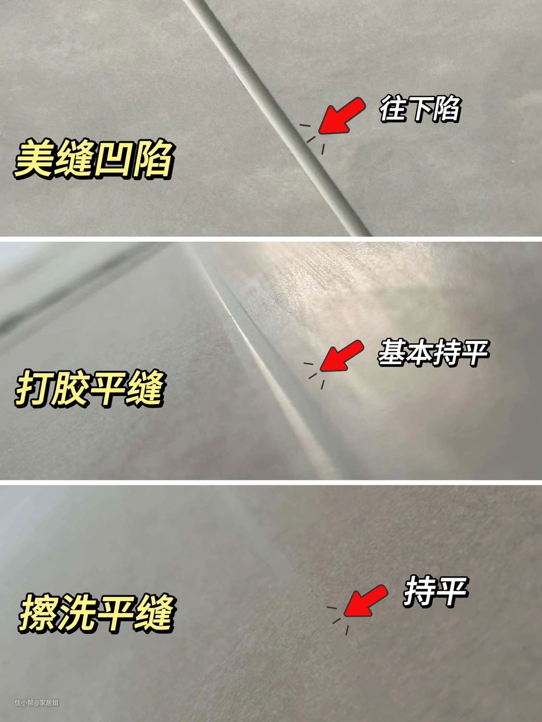 平缝与凹缝的工艺差别主要在于压缝这一步,平缝是用刮板来刮,用的擦洗工艺,让瓷砖与美缝剂在同一水平线上。