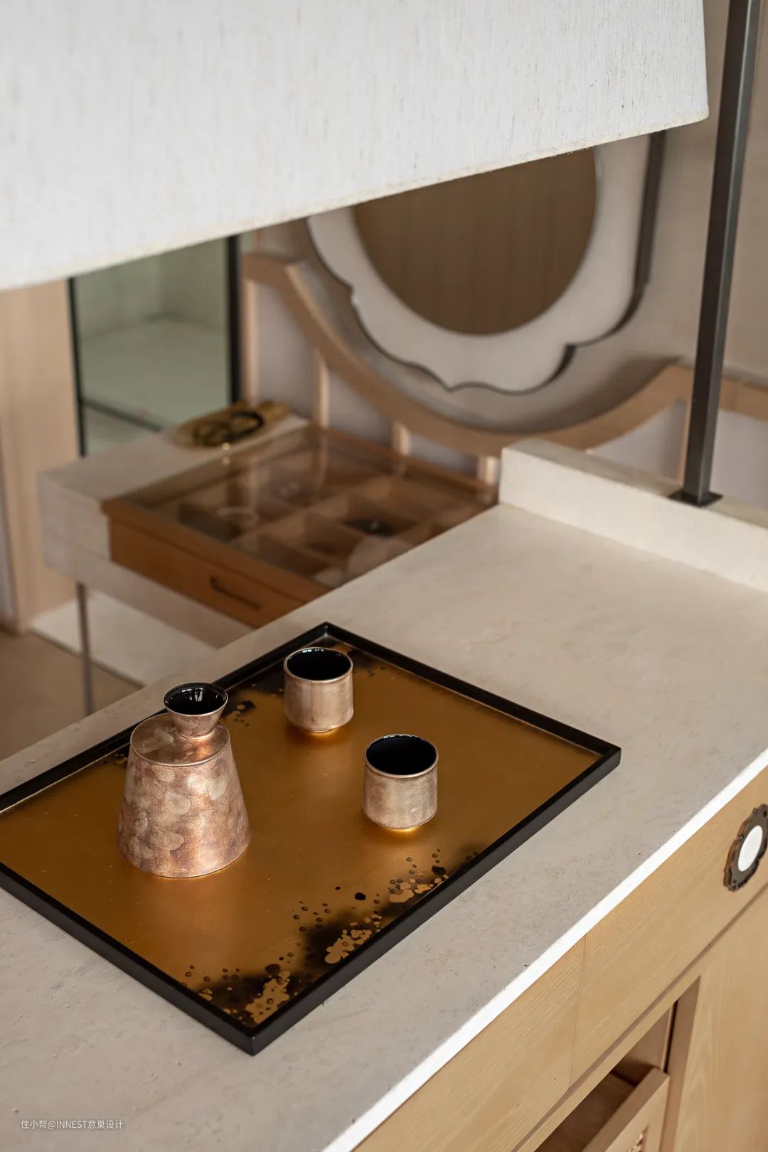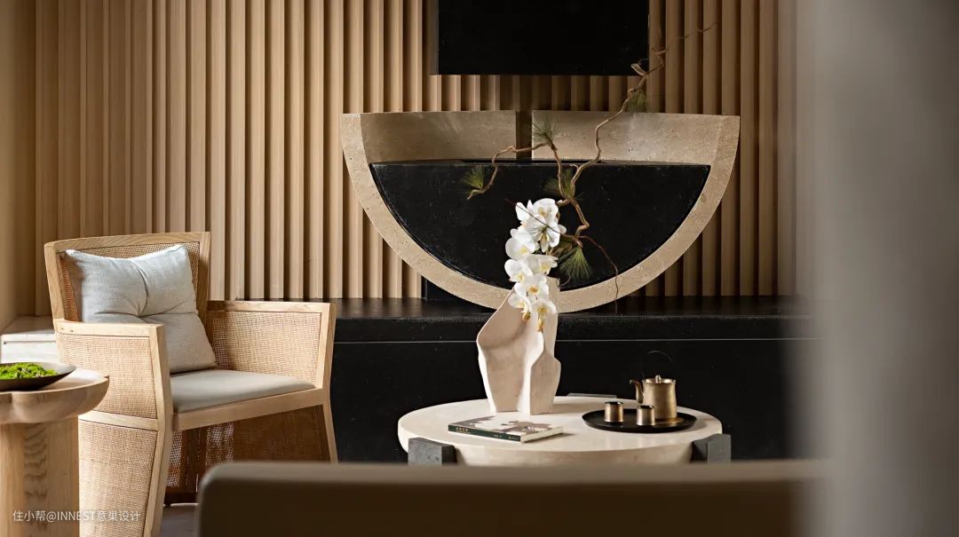 在这里,每个细节都被精心考量。沉稳的黑色大理石,与温暖的木纹相映成趣,再加上简约而现代的家具,每一件都像是精心挑选的艺术品。而置于桌上的金属茶具,闪烁着柔和的光泽,为空间增添了一抹东方的精致与内敛。
