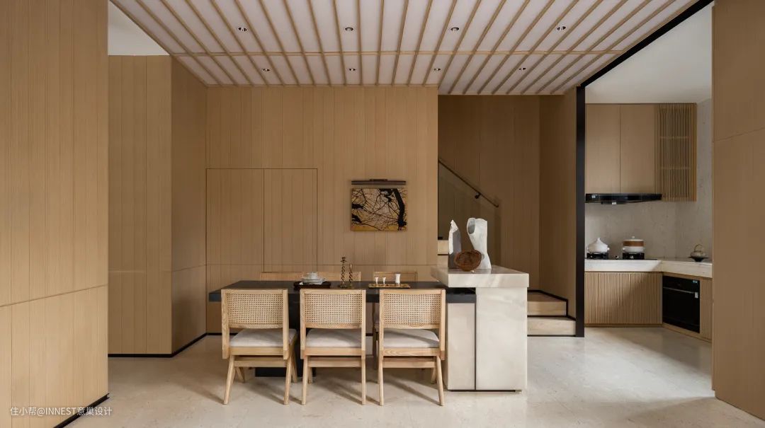 厨房融合了自然元素与人文思考,将“土”与“木”这两种东方元素巧妙结合,打造出一个简洁而又不失精致的烹饪环境。淡雅的石材台面,触感细腻,带有微妙的纹理,恰如自然界的无穷变化,充满了自然的韵律和生命力。