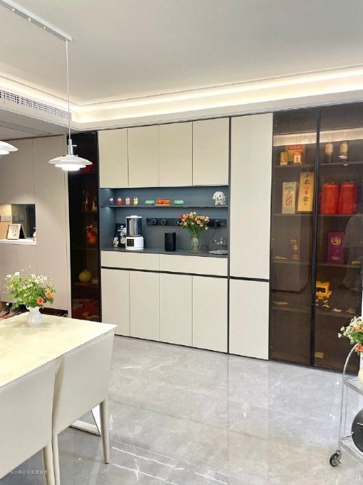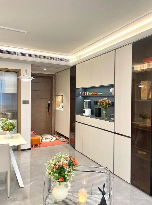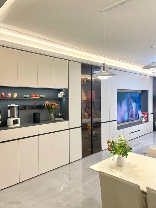设计师还将实用性与美观性完美结合。餐桌、椅子与吧台的布局,既满足了日常用餐和休闲的需求,又为空间增添了互动性。大屏幕电视作为现代家居的重要元素,不仅提供了丰富的娱乐内容,更以其独特的设计感与整体空间相协调。