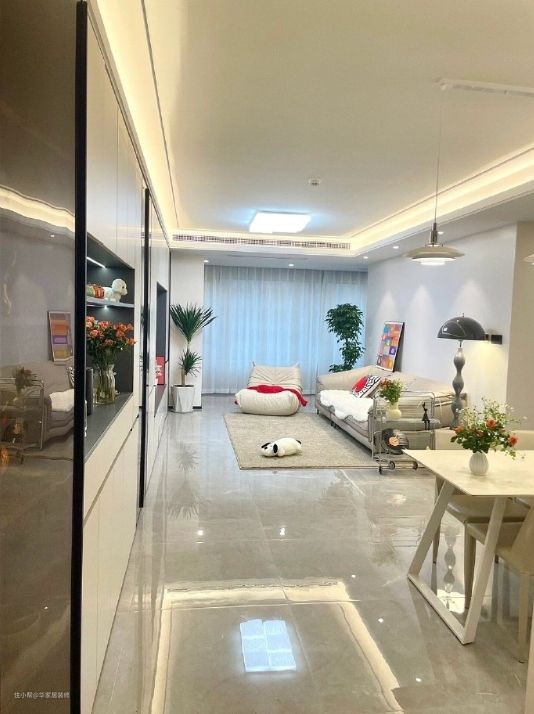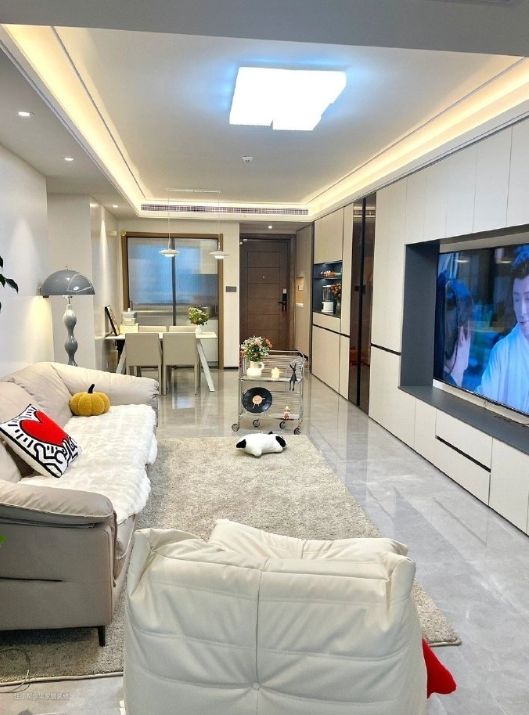 家具选择上,白色的沙发和单人椅与整体色调相呼应,而带有图案的抱枕则为空间增添了一抹生动的色彩。圆形咖啡桌与装饰品、书籍的点缀,展现了现代生活的精致与品味。而现代化的灯具不仅为空间提供了充足的光线,更以其独特的造型为室内增添了时尚感