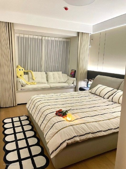 在色彩搭配上,设计师巧妙运用了黑白灰的经典组合,营造出低调而高级的氛围。大床的黑白条纹被子与枕头,与地板上的黑白相间地毯相呼应,营造出统一而和谐的视觉效果。灰色的床头靠垫与白色沙发相互映衬,为空间增添了一抹温暖与舒适。