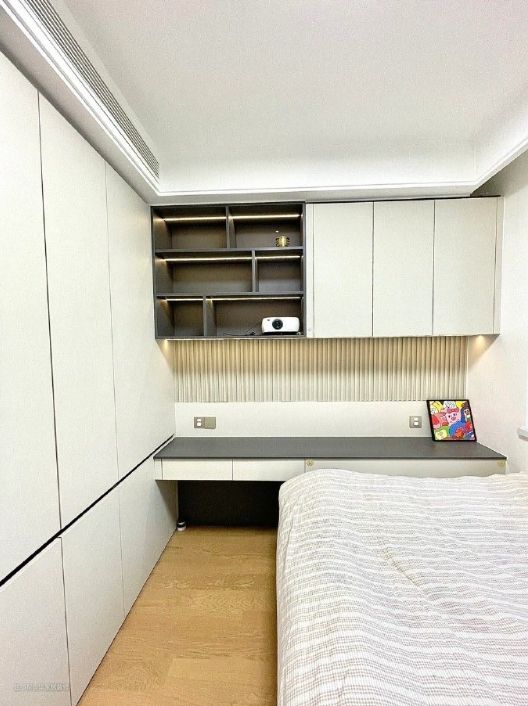 在房间一侧,设计师巧妙地设置了一个工作区,黑色台面的设计不仅与整体风格相协调,还增添了一抹现代感。工作区旁边的小型书架,不仅提供了展示书籍和装饰品的空间,还成为了一个美观的装饰元素。