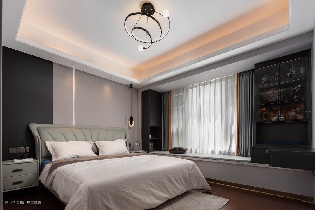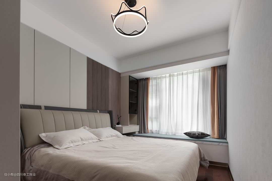 主卧整体的空间不算特别宽敞,整体纵深较长,侧面还带有一个飘窗来增加空间的自然采光,结合房子的装修风格,在中间做了LED灯做主灯设计。