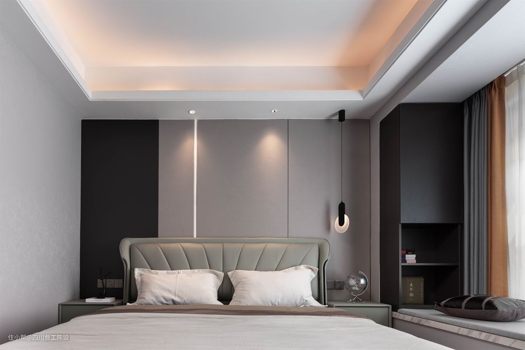 床头背景墙整体颜色比较统一,中间使用灰色护墙板加强隔音,中间智能灯带渲染空间大气轻奢的氛围,因为飘窗上安装了黑色的定制柜,所以床头左侧也对称做了黑色的护墙板。