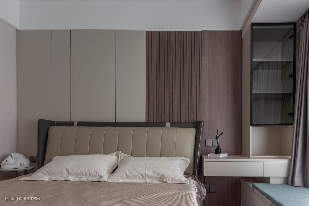整个空间颜色单一,容易显得单调,所以背景墙的下方装了一个木质的半墙护墙板进行分色,整个空间更显层次和丰富,灰色的床头软包耐脏耐看不易过时。