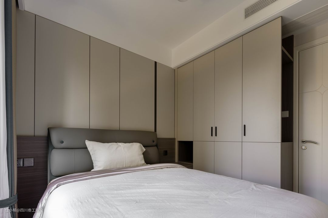 最后一间次卧是这三个卧室中最小的一间,户型方正,设计师不想浪费一丝空间,左侧安装了顶天立地柜,想到收纳的物品较多,柜体分为了上下两层,靠门的地方还留空做了小玄关。