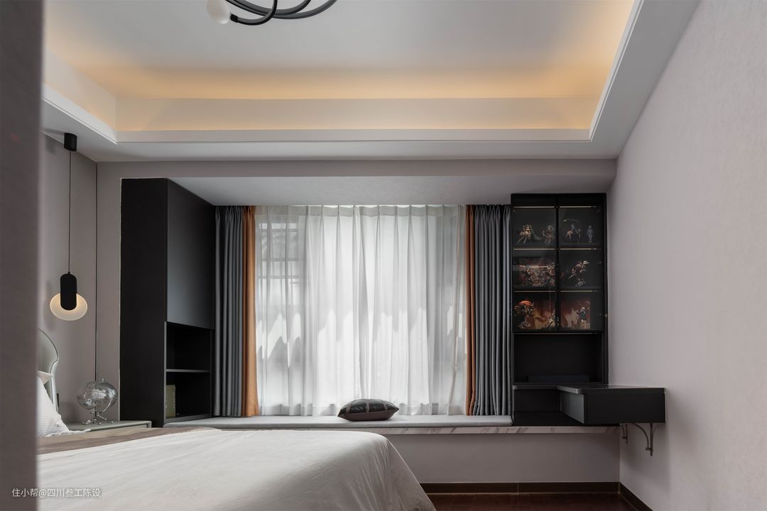 次卧的装修要简洁不少,同样是带有一个飘窗,但这次只做了一面的柜体进行收纳,窗帘选用双色拼接,视觉上更有对比,窗台上铺有软垫,可以坐在上面欣赏城市美景。