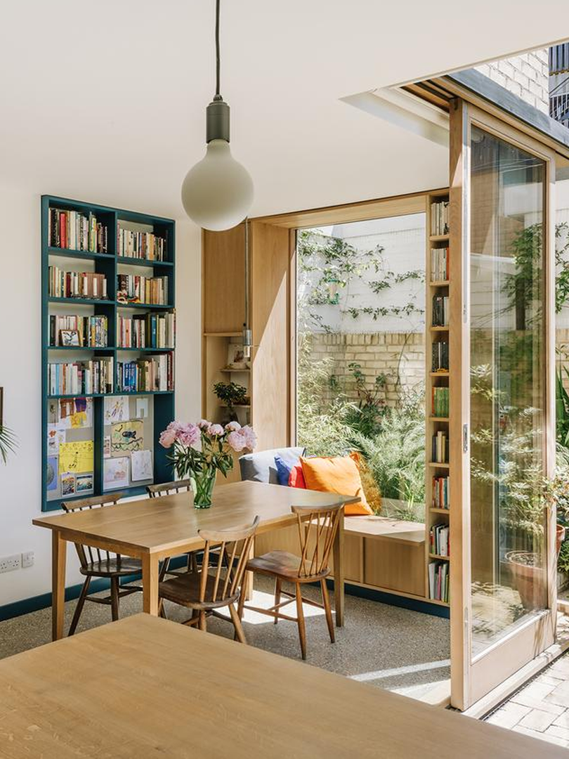 对于落地落地飘窗,位置孤立、窗户较高的,可以做成“阶梯式”卡座,储物量更大。