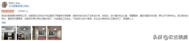 “找云兰装潢装修已经是第二套房子了,由于第一套房子装修的不错满意,所以第二套房子还是找的云兰。设计师杨清服务态度好,设计能充分利用好房子空间,施工队长王丁成王队长服务态度也好,所有施工进度工人安排都很紧凑工期还能提前。完工后有任何意见要求设计师和施工队长都能及时反馈解决,让我们感觉云兰的售后服务很到位。最后想说今年我们第三套房子还想找云兰装潢装修!”