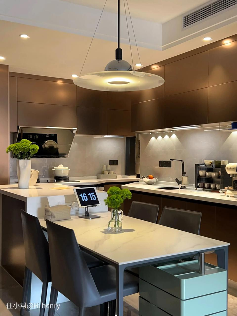 餐厅常用薄款的飞碟灯或PH5吊灯,建议吊灯高度距离餐桌650~700mm。