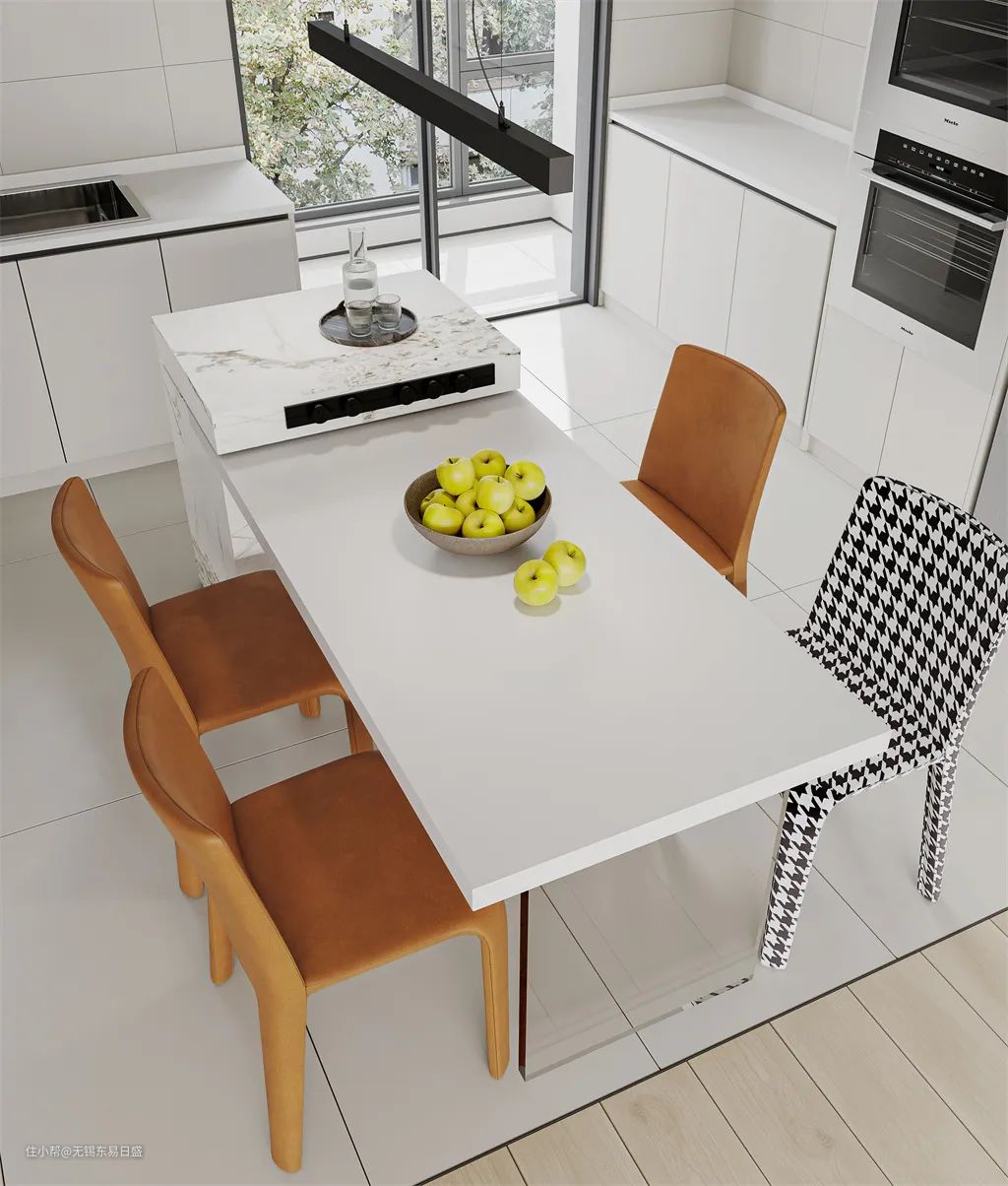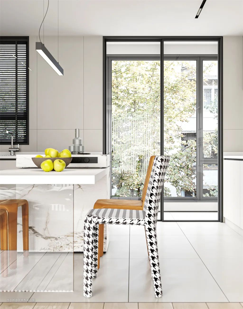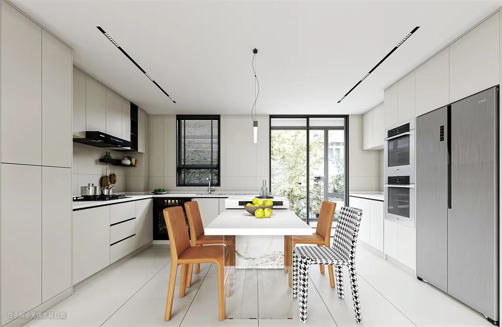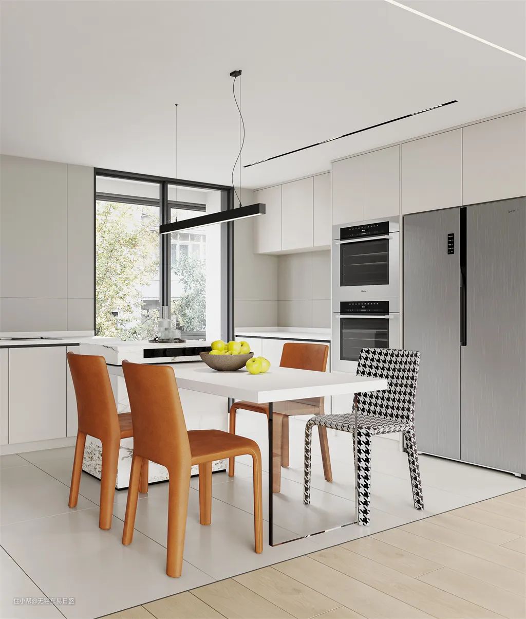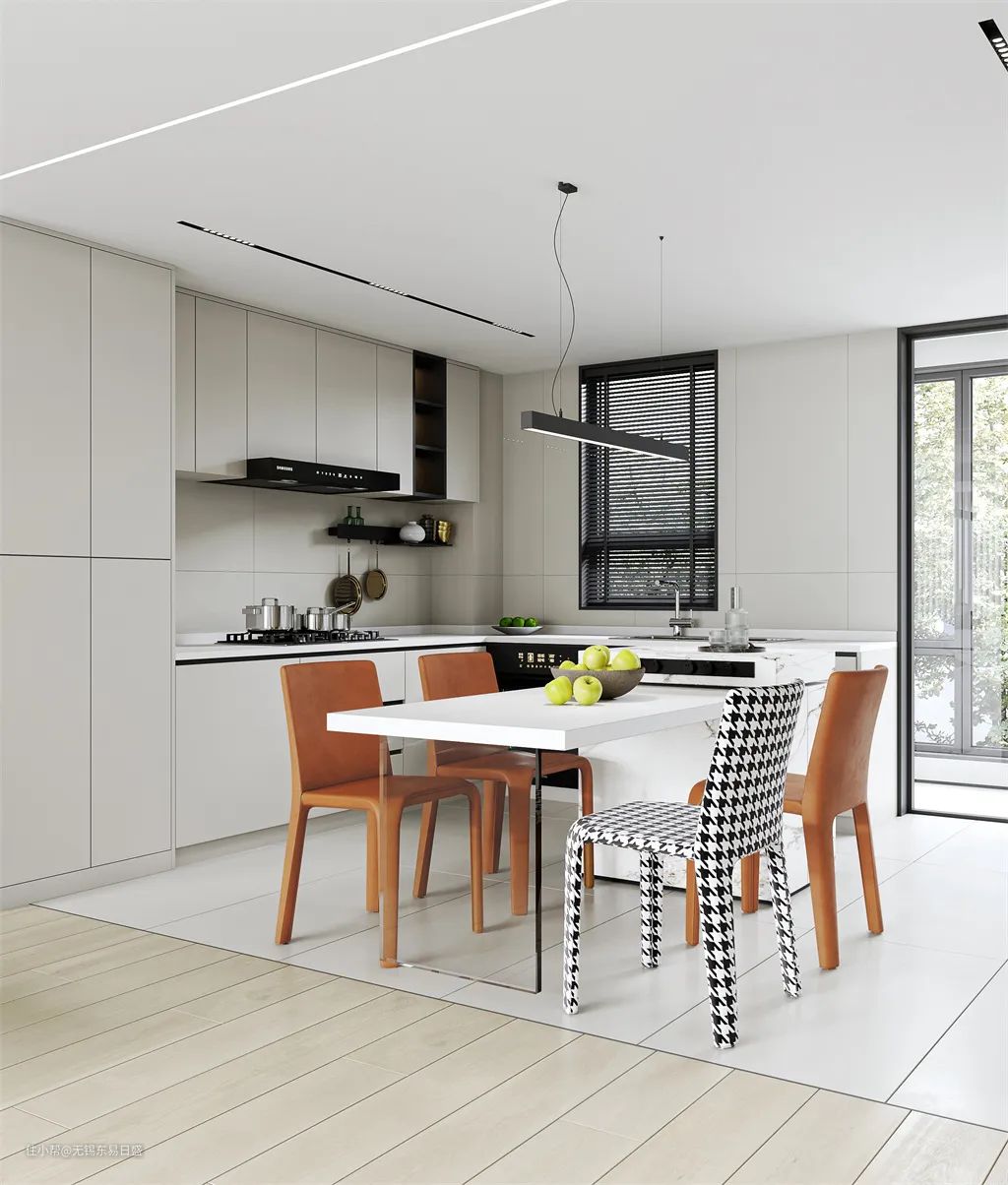 餐厨地板选择白色瓷砖,增加了空间的明亮感和宽敞感。整体设计简约而精致,营造出一个舒适、现代且实用的餐厨空间。