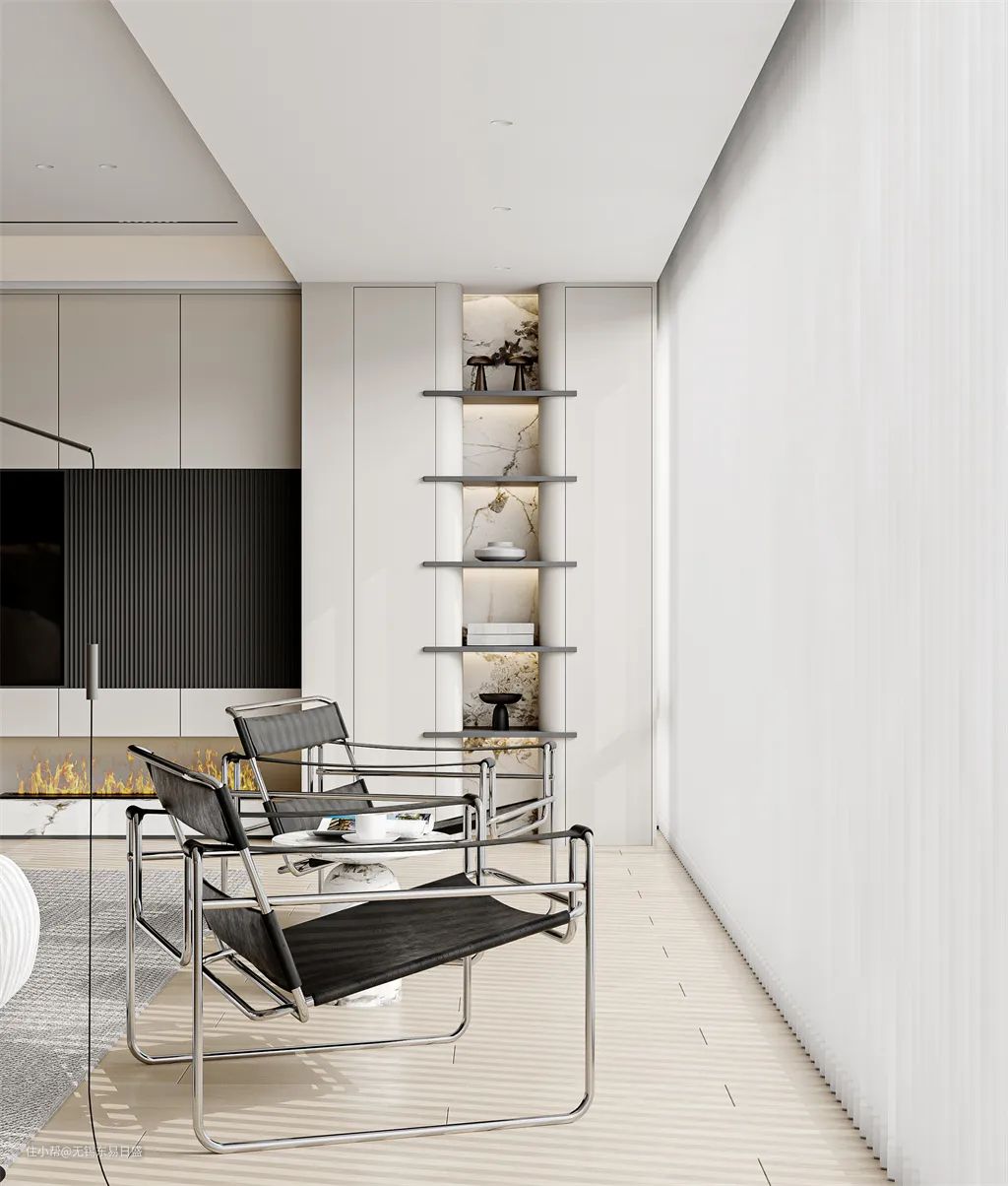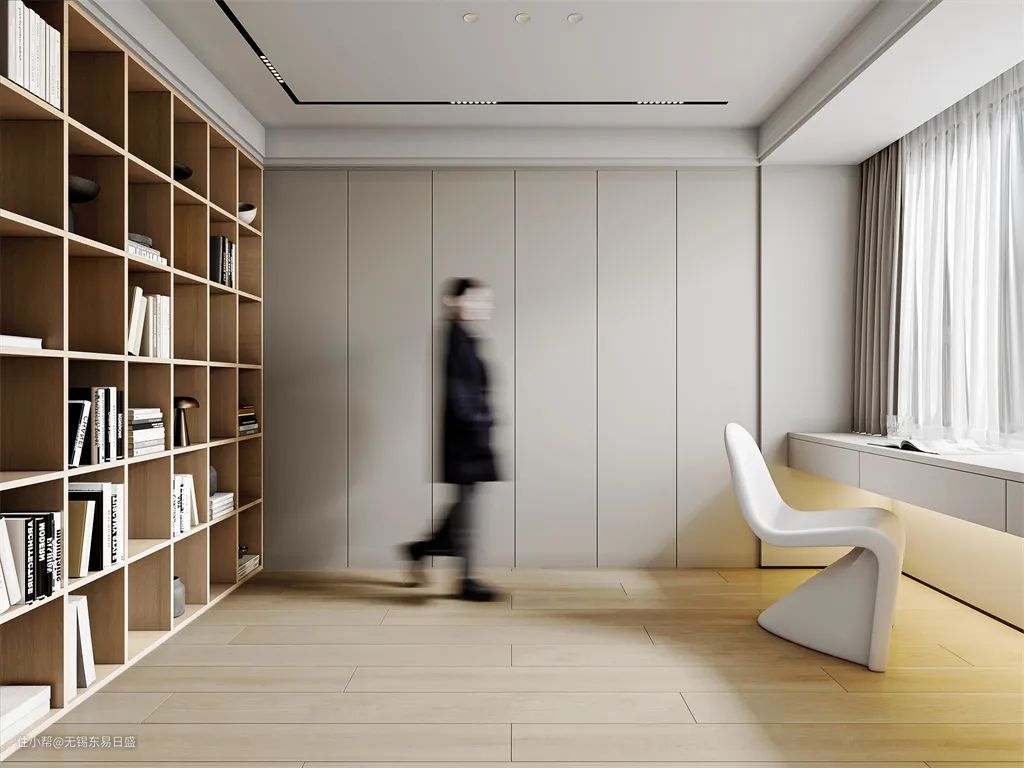 一门到顶的开放格子书柜,用来摆放书籍和装饰品,提供一个良好的阅读氛围。窗边设计了白色柜体,搭配舒适的白色椅子,既可以用来看书写作,又可以作为办公或化妆区域。整体设计简洁明快,提供了一个灵活多用途的空间,满足家庭成员不同需求。