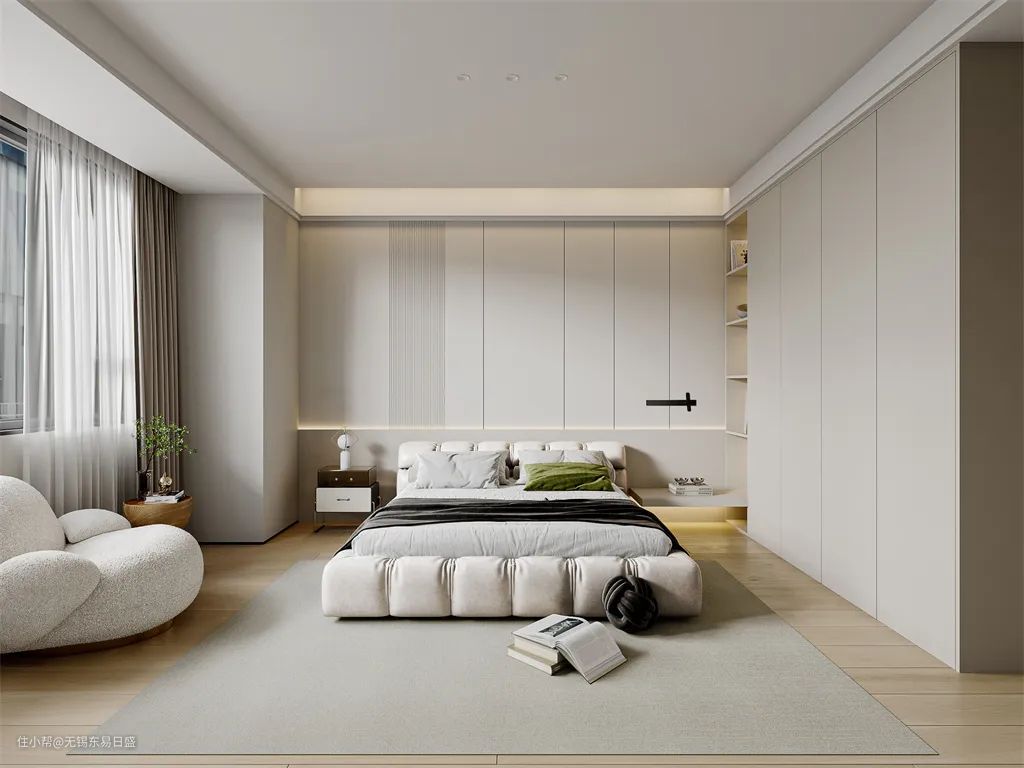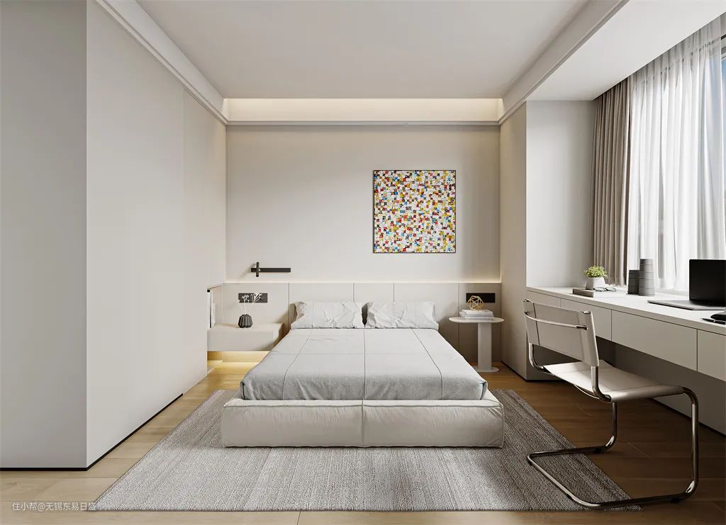 主卧延用极简设计风格,色彩搭配以白色为主,搭配双眼皮吊顶和无主等装修设计,勾勒出得休憩空间既素雅干练,又简约温馨。靠墙一侧设计了一门到顶的封闭式衣柜,一方面保证了空间的完整性和统一性,另一方面给家人提供了充足的储物空间。
