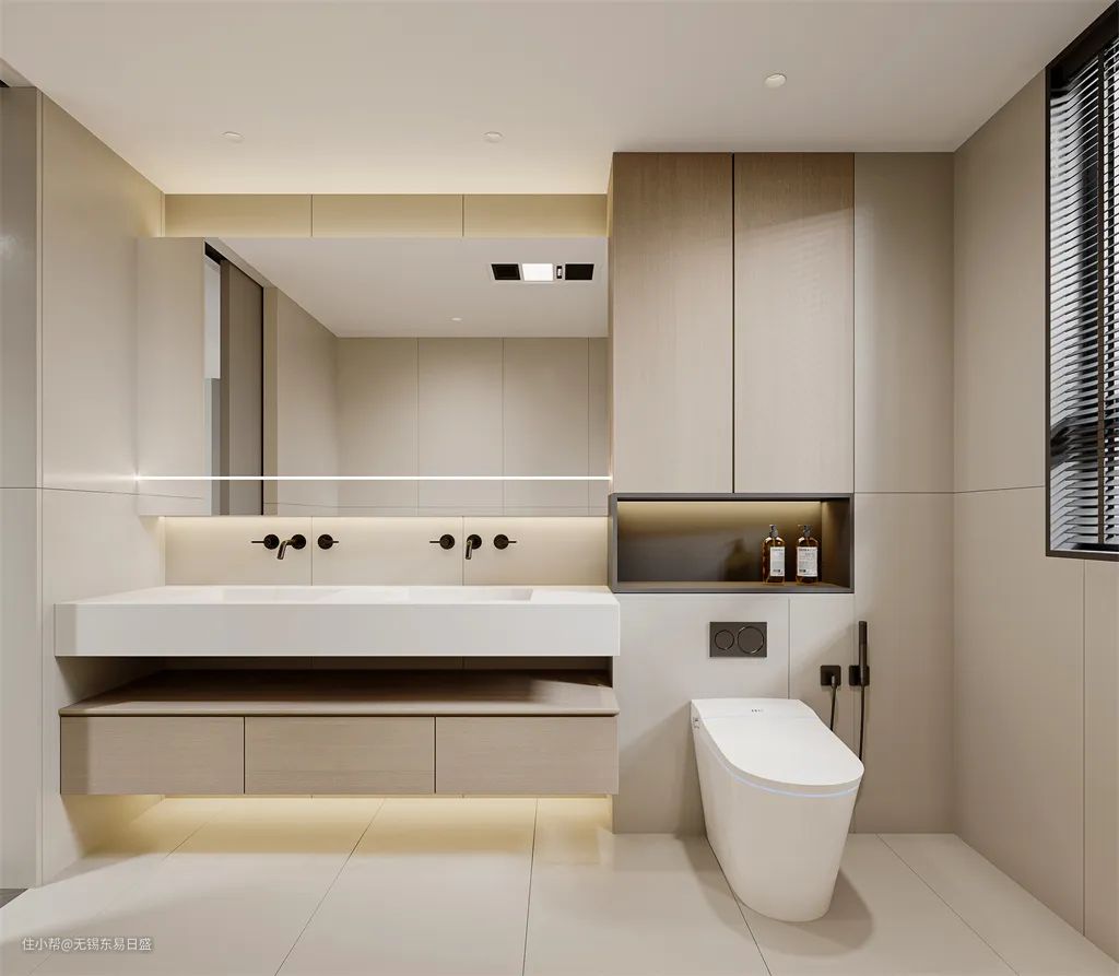 卫生间干湿分离的设计,提高了空间的使用效率。悬浮式洗手台设计,增加了空间的开阔感。马桶背后设计了一体式柜体,提供了储物空间,并在局部设置开放格,方便放置常用日用品。