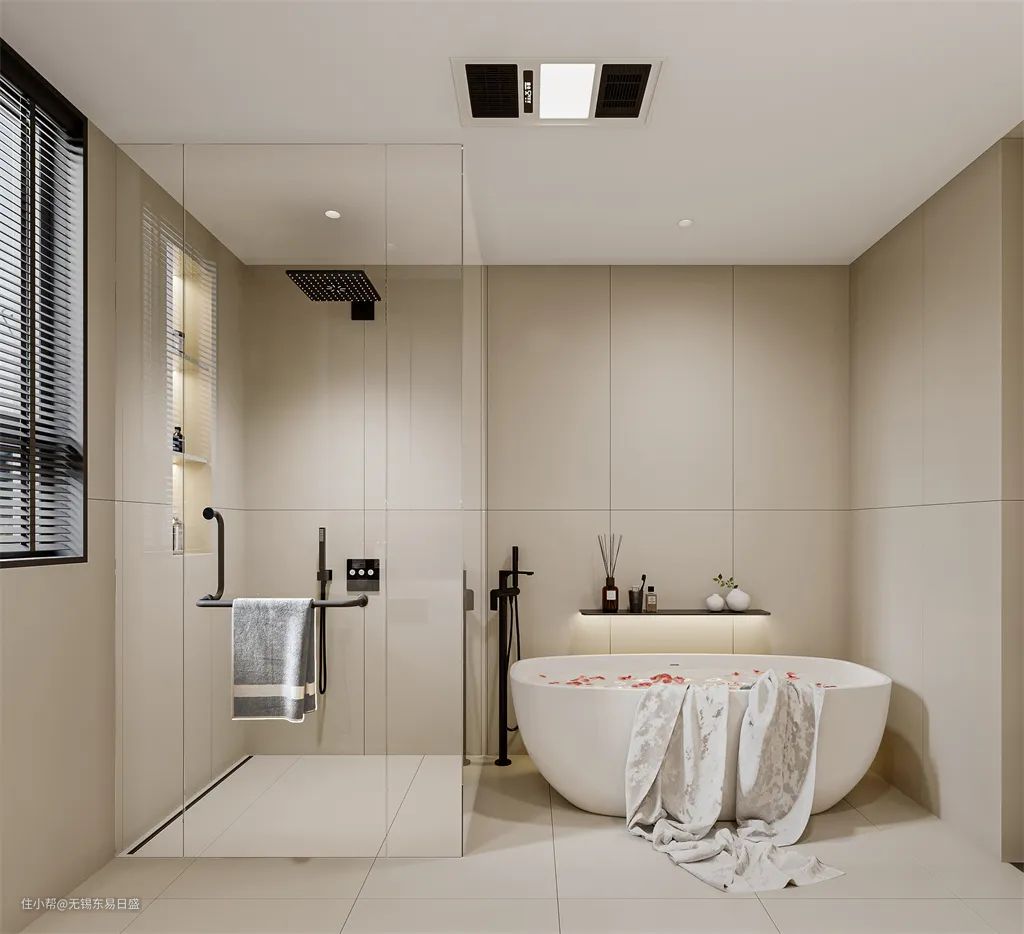 此外,卫生间还配备了舒适的大浴缸,为居民提供了放松身心的享受空间。整体设计既注重了实用性,又兼顾了舒适度和美观性,打造了一个现代、极简且舒适的卫生间环境。