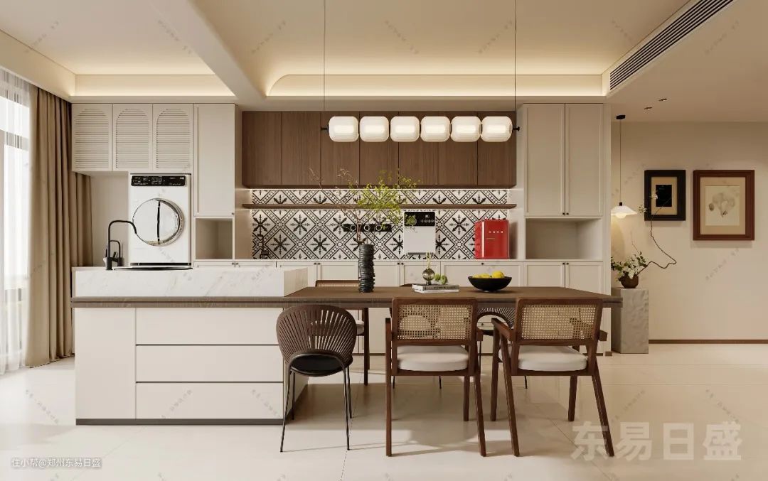 餐厅区域古色古香的中古风,风格的融合创新,满足了屋主对复古、浪漫和传统文化的追求,大理石,藤编餐椅,都在诉说着空间的精致与艺术。