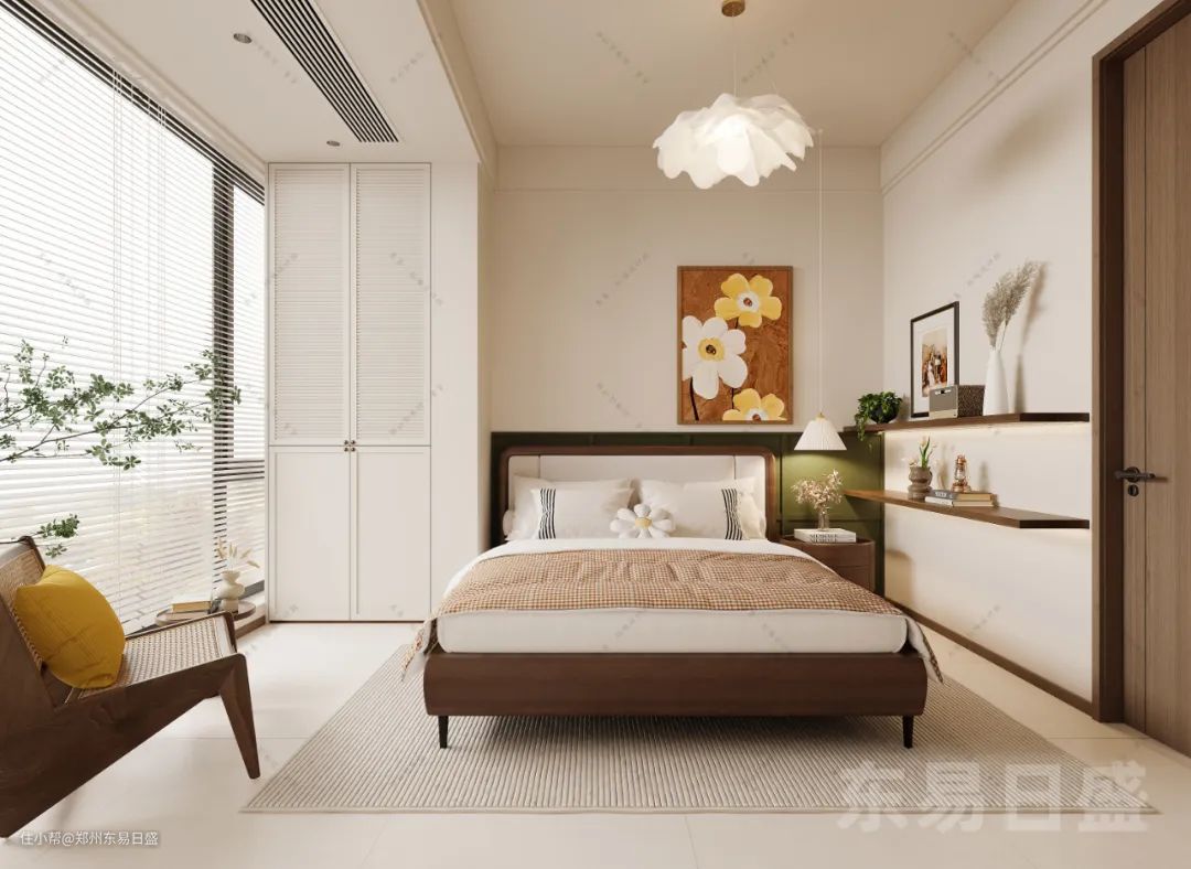 次卧整体空间更加简洁温馨,墙面设计木质层板,日常可以摆放精致的摆件,增加空间的氛围感!