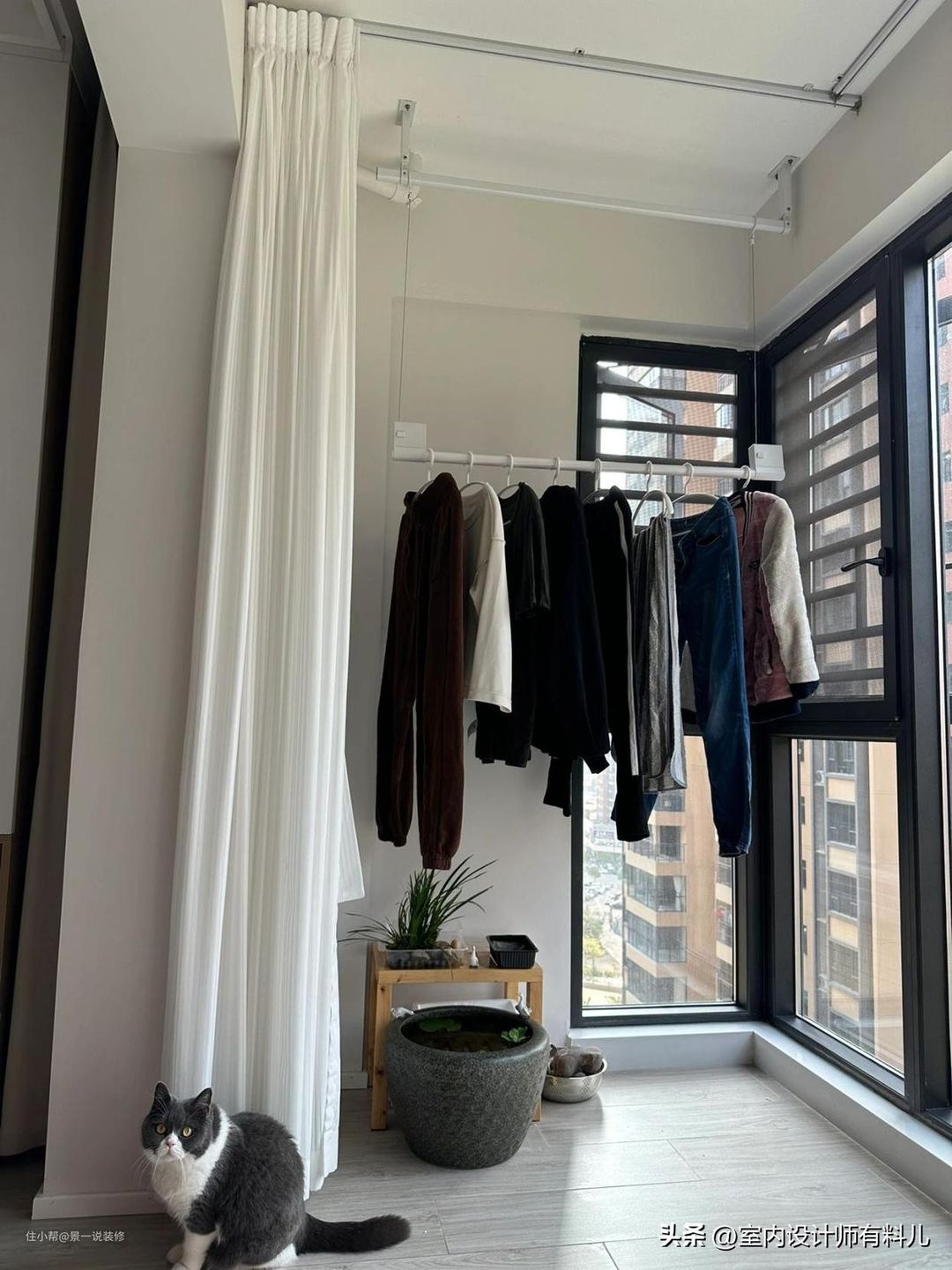 然后晾衣区装个纱帘,平时敞开,有客人来的时候再把纱帘拉上,无论是正面、侧面都看不见衣服。