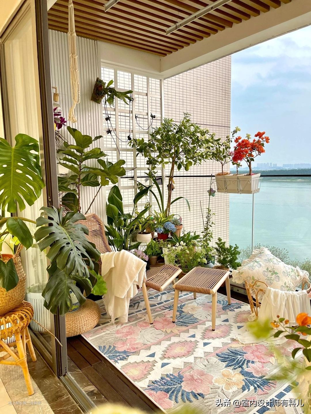 装修时地面选择了户外防腐实木卡扣地板,搭配一张户外地毯,防水又实用,这么美的花园阳台,每天打理都是一个治愈的过程,坐在这里看书、喝茶就更舒服了。