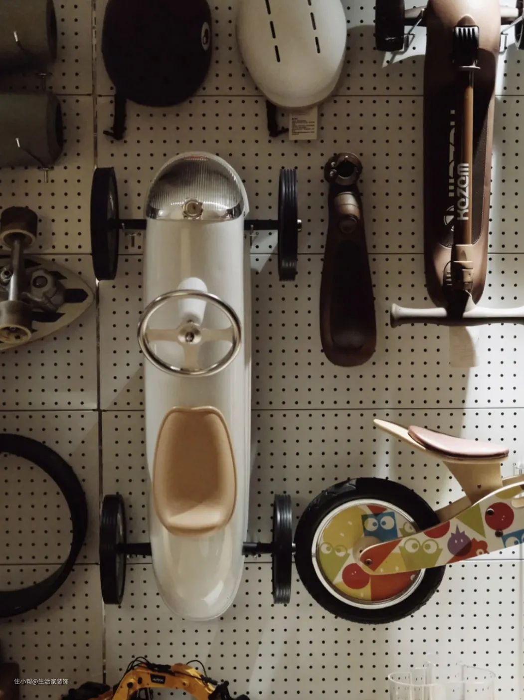 在玄关设置储物区,可以存放滑板车、自行车等儿童器材,孩子玩耍回家后可以自行存放,养成收纳习惯。幼儿家庭还可以存放折叠婴儿车,方便外出。