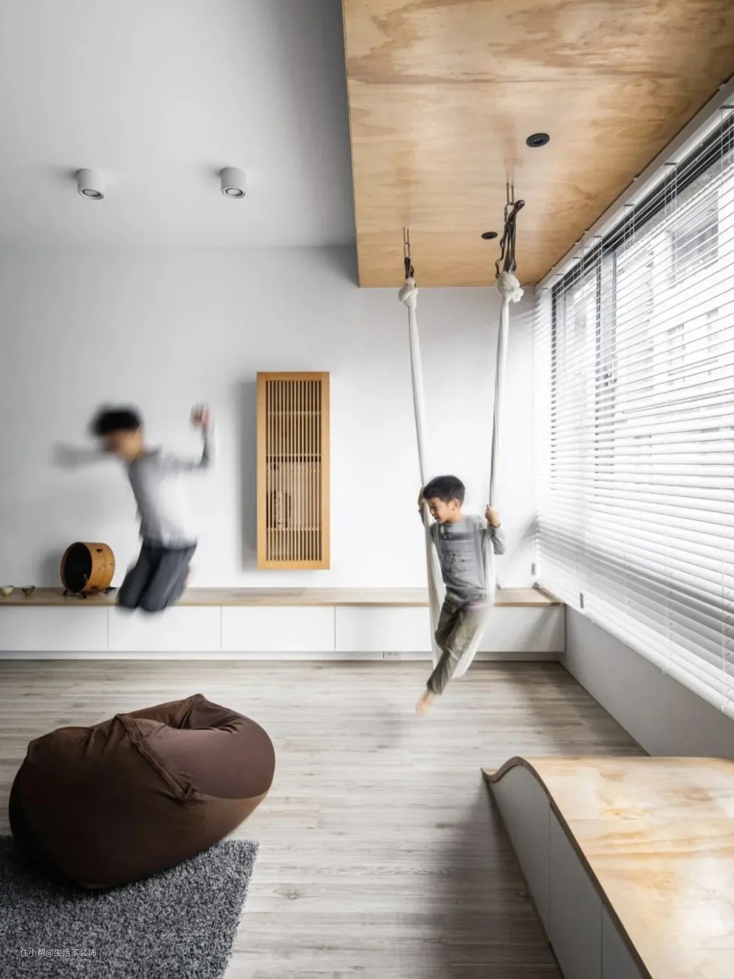 一块地毯、一顶小帐篷,或是将阳台抬高,都可以营造一个独立的空间给孩子。也可以利用空间做一些有趣的娱乐设施,比如滑梯、秋千、攀岩壁等。