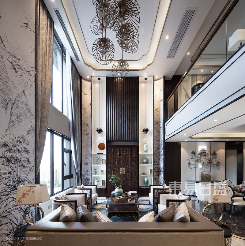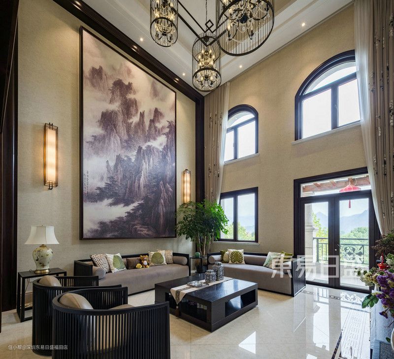 新中式风格的别墅客厅布局通常融合了传统中式元素和现代设计理念,注重舒适、大气和文化内涵。以下是一些布局建议: