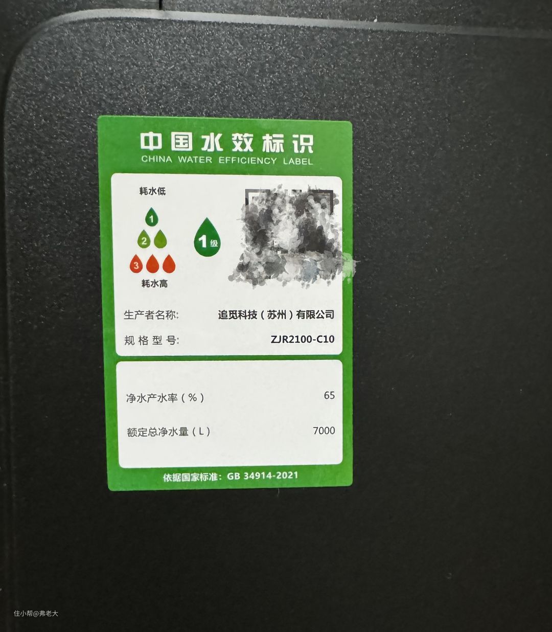 追觅U20厨下净水器的产水率高达71.9%,意味着滤制相同体积的净水,附带产生的废水更少,当然更加省水。这一产水率数值甚至优于国家一级水效标准(65%),凸显了绿色节水的特性。在机身侧面,亦可看到水效标识贴纸。