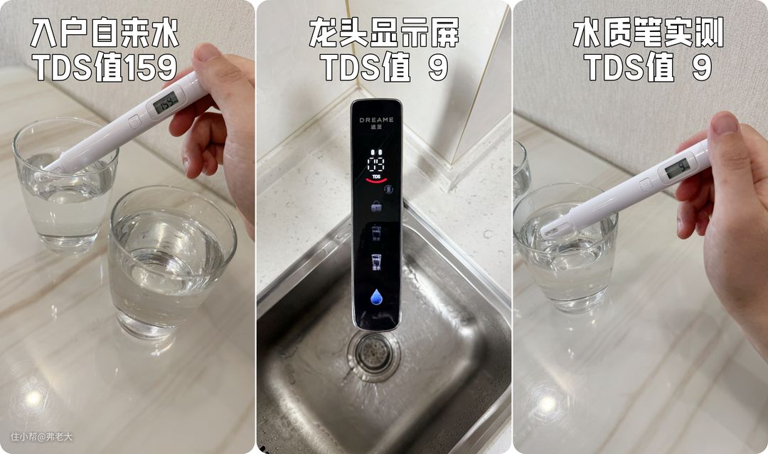 实测表明,过滤前的入户自来水TDS值为159,过滤后龙头显示屏的TDS值为9,而水质检测笔测得的TDS值也为9,净水效果一目了然,绝非吹嘘。而且,广义上净水器的TDS值只要不超过50,通常就被认为是适宜直接饮用的水质标准,而追觅U20厨下净水器净化后的水质TDS值竟然不到10,称之为精益求精的旗舰级性能也毫不为过。