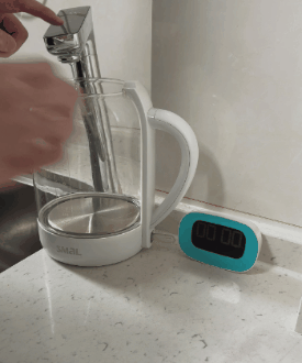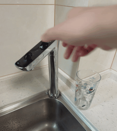 官方宣称的冷水流速为2.1L/min,温热水流速为4.8L/min、沸水流速为2.7L/min,楼主也进行了测试,用冷水、温热水和沸水分别灌注1L水壶,并计量时间,实测结果表明:冷水、温热水、沸水分别用时24秒、13秒、26秒,换算为每分钟流速,即为2.5L/min、4.62L/min、2.31L/min。请看下方动图演示: