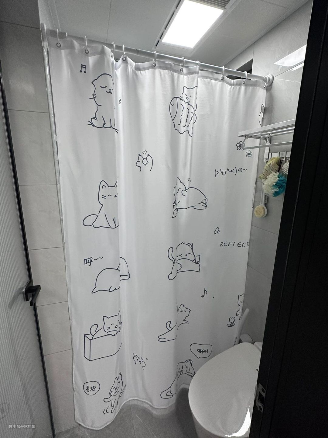 卫生间比较小,没有装玻璃隔断,但是水会溅到浴室柜以及智能马桶上,于是加装了浴帘,对懒人真的太友好了。