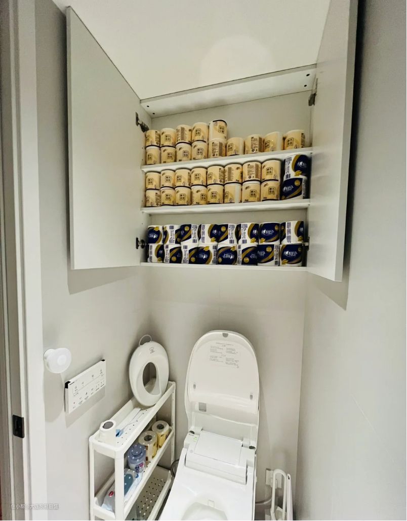 并且因为把厕所和洗漱分离 ,也不用担心会有水渍的影响,所以我们可以直接在马桶的上方增加一组储物柜,这样平时的卫生纸和屯好的物品,都是可以直接放入其内,非常的方便。