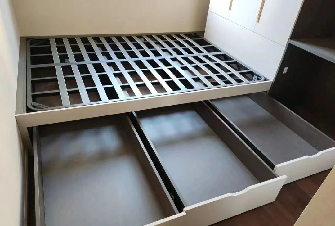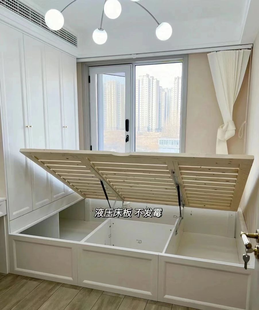 ①定制床框排骨架和滑轮大抽屉或者选择液压床板,都是透气不发霉返潮的好选择。