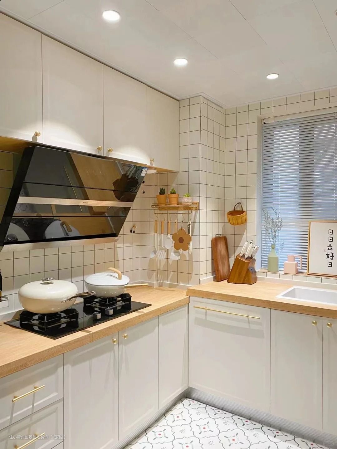 ▫️白色石英石水槽、白色百叶窗帘、白色射灯、白色锅具等白色厨房物品的搭配,会让厨房看起来更整洁哦!