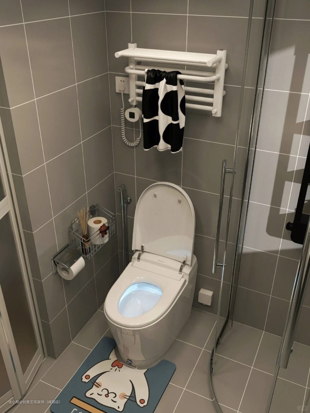 淋浴间旁装了全自动的智能马桶,内置水箱冲水没有水压限制,简约的外观也很时尚大方~小户型卫生间尤其建议选择带有智能除臭、紫外杀 菌的智能马桶,上厕所更卫生,卫生间环境也会改善很多。