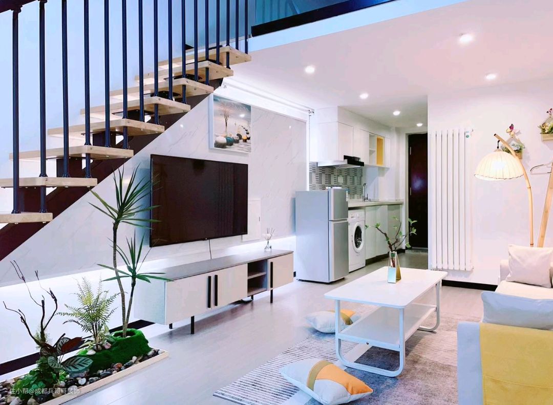这套房子是一个复式LOFT公寓,采用半搭设计,二楼设计一个房间,半搭扶手设计,一楼生活区,二楼休息区分布明确
